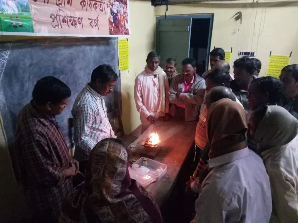 गोग्राम वार्ता : किसानों को गोबर और गौ मूत्र की उपयोगिता सिखाने एवं जैविक पद्धति द्वारा कृषि करने के लिए प्रेरित करने हेतु नियमित रूप से किसानों का प्रशिक्षण वर्ग होता है। इन प्रशिक्षण वर्गों में गोबर और गौ मूत्र द्वारा खाद निर्माण, कीट नियंत्रक , अग्निहोत्र, गौपूजन,गोबर द्वारा धूपबत्ती दीपक का निर्माण इत्यादि सिखाया जाता है। इस कड़ी में केशियारी ब्लॉक के गगनेश्वर मंडल के परुलिया ग्राम में 5 दिवसीय प्रशिक्षण वर्ग M S K Madhymik School में संपन्न हुआ। इस प्रशिक्षण वर्ग में 40 किसानों ने भाग लिया। सभी ने प्रशिक्षण के इस कार्य को अपने कार्य क्षेत्र में निरंतर करने और अन्य लोगों की सिखाने का वचन दिया।